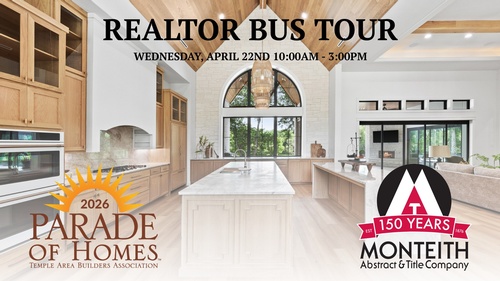 Join us for the TABA Parade of Homes Realtor Bus Tour sponsored by Monteith Abstract & Title for a fun day of touring award winning homes, seeing the latest in design and construction trends, and connecting with fellow real estate professionals along the way.