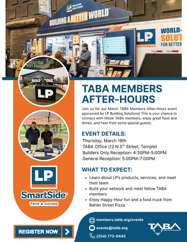 Join us for our March TABA Members After-Hours event sponsored by LP Building Solutions! This is your chance to connect with fellow TABA members, enjoy great food and drinks, and hear from some special guests.